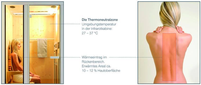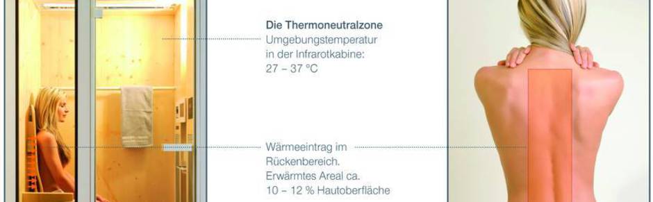 Die Niedertemperatur-Infrarotkabinen von Physiotherm arbeiten innerhalb der Thermoneutralzone (Lufttemperatur zwischen 27 und 37°C). Bei ca. 30°C Lufttemperatur wird der Rücken durch einen speziell entwickelten Strahler (mit Lavasand gefüllter Keramikstrahler) gleichmäßig und berührungslos mit Infrarotstrahlung erwärmt. Die Wärmezufuhr erfolgt also ausschließlich lokal begrenzt, über 10 bis 12 % der Hautoberfläche (idealerweise Rücken), durch eine ununterbrochene Infrarotbestrahlung. Die Wärmeintensität kann an das individuelle Wohlbefinden bzw. die individuelle Wärmeaufnahmefähigkeit angepasst werden.