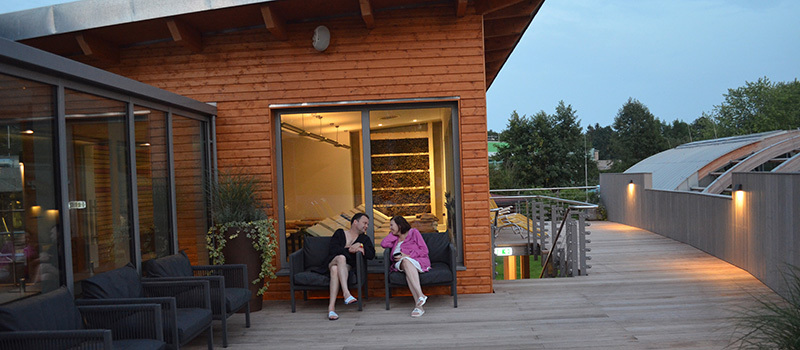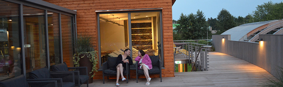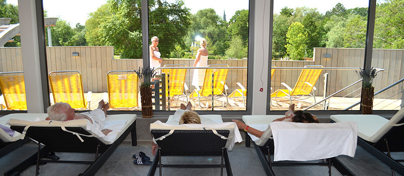 Die Solewelt wurde auf Stelzen gebaut: Auf einer 180 qm großen Fläche gibt es in luftiger Höhe einen 70°C warmen Sole-Erlebnisraum und einen Sole-Entspannungsbereich mit Außenterrasse. Aus der Sauna und von der Außenterrasse schweift der Blick frei über den weitläufigen Kurpark und die Ilmenau-Auen. Im Sole-Erlebnisraum werden regelmäßig sanfte Aufgüsse angeboten. Träumen Sie hier zudem beim entspannenden Klangschalen-Aufguß.